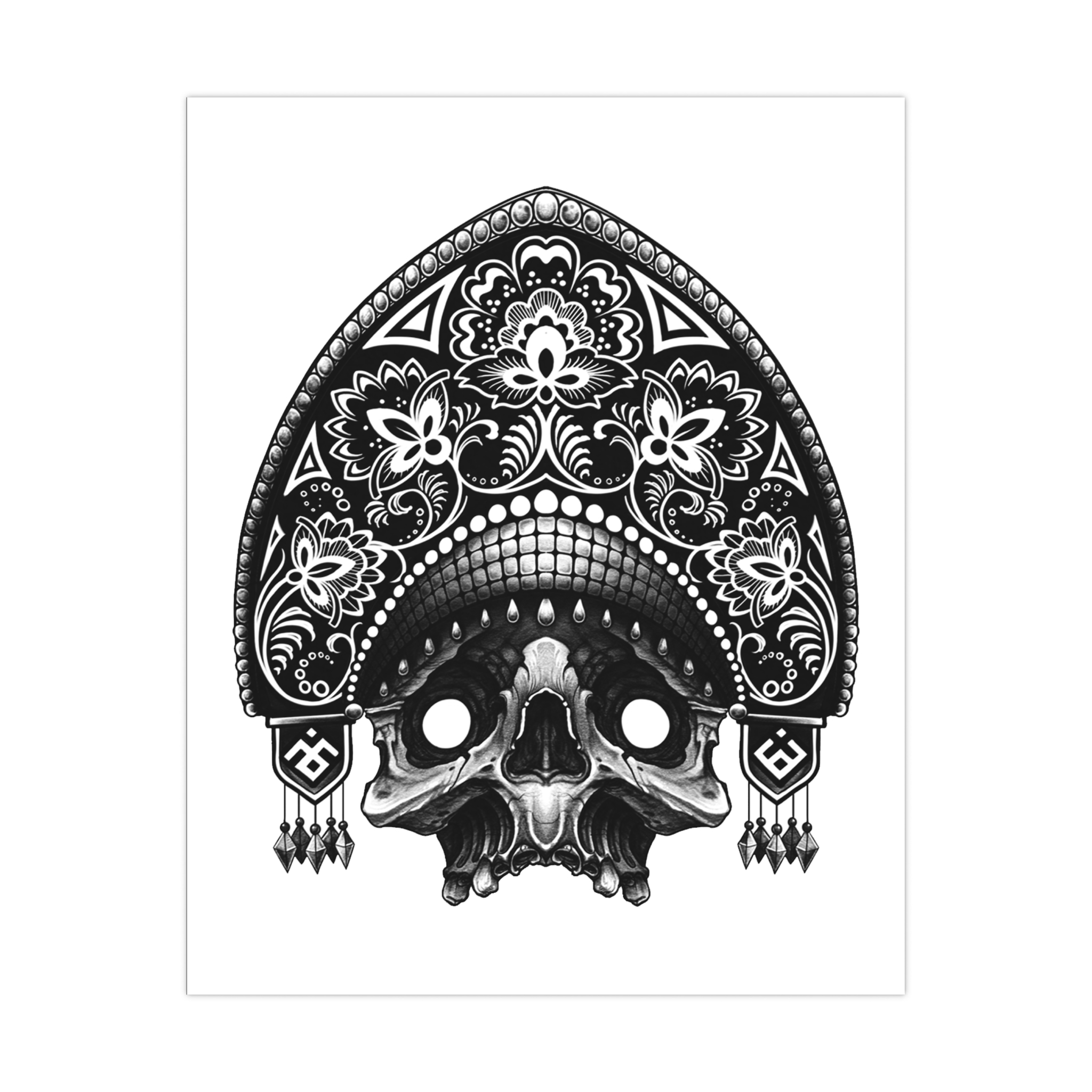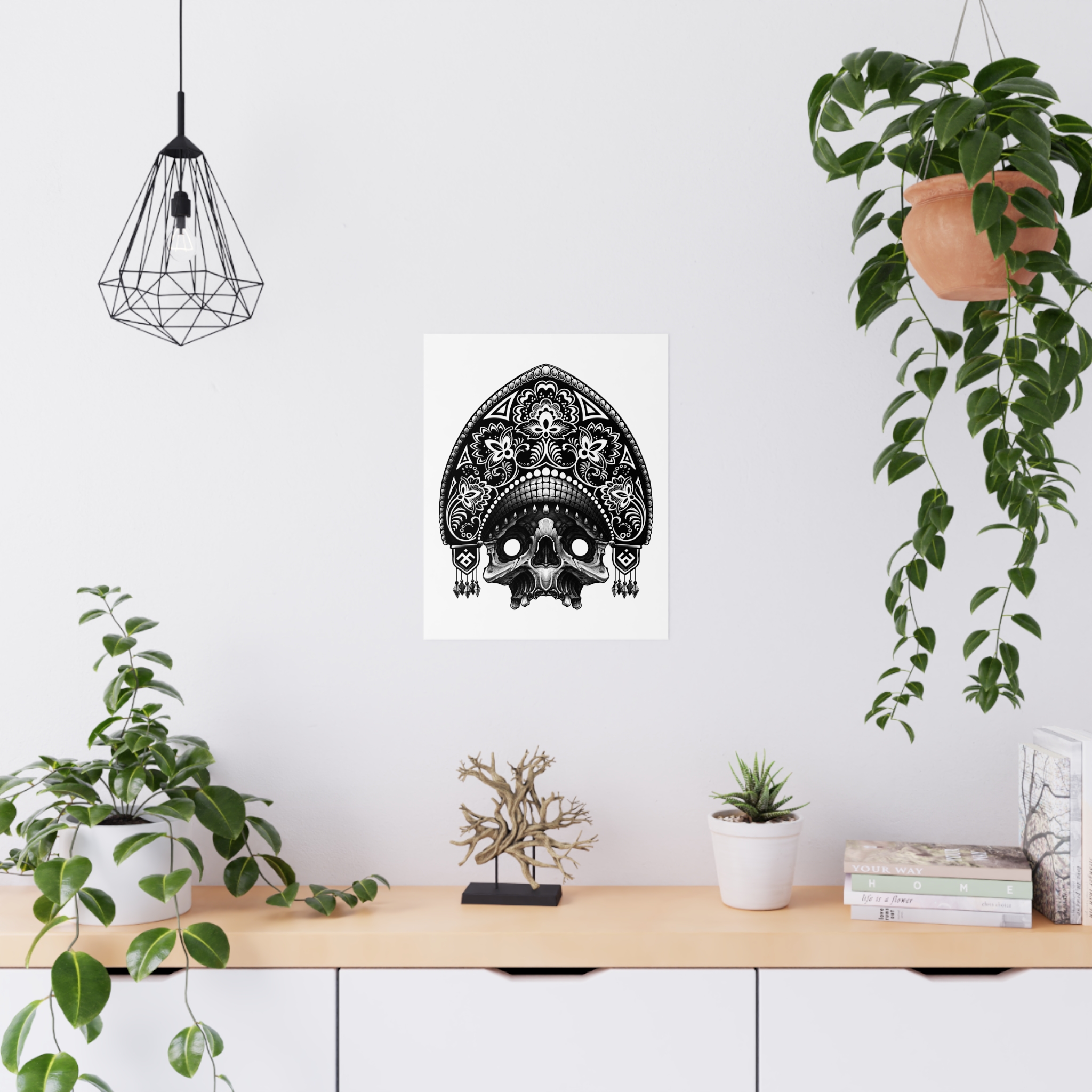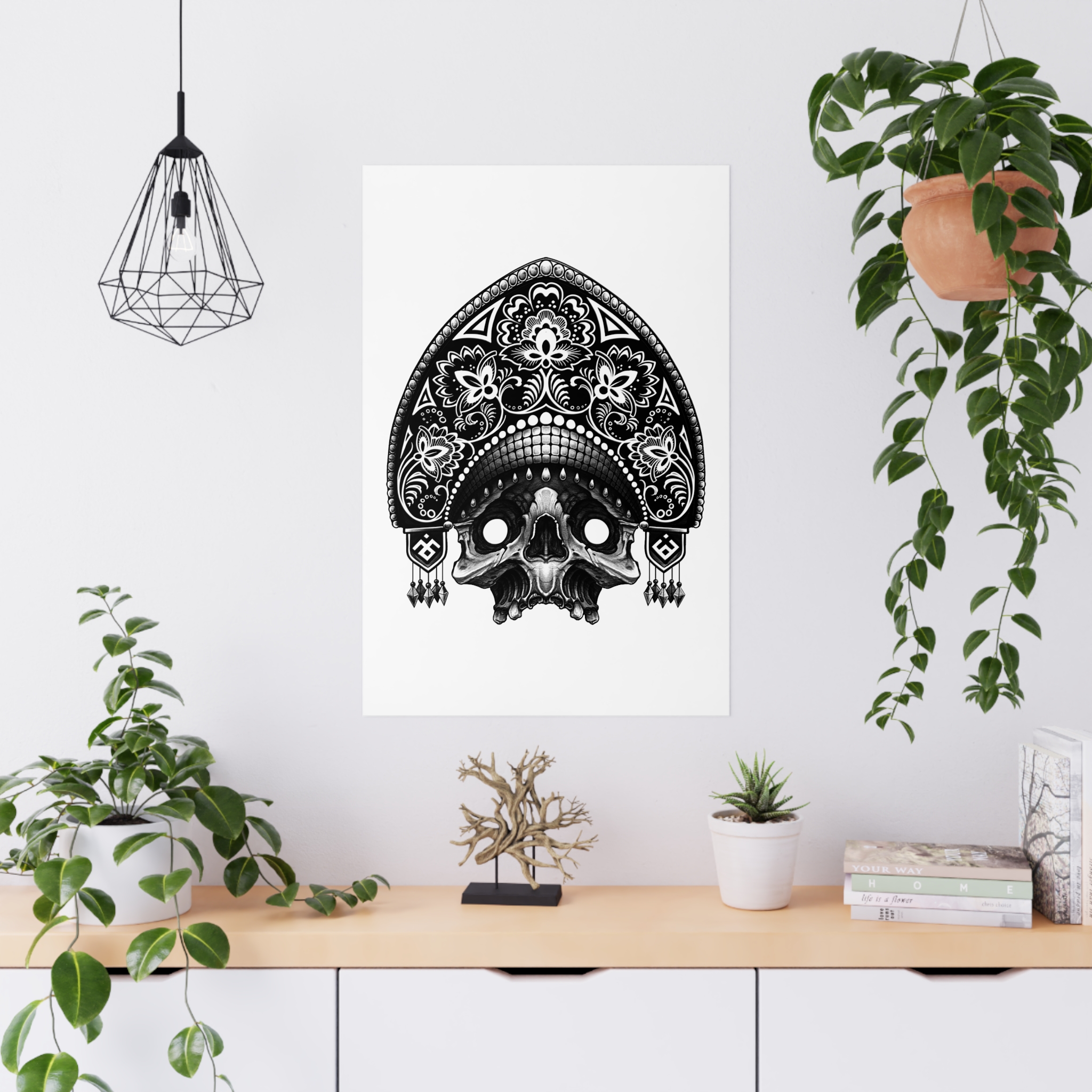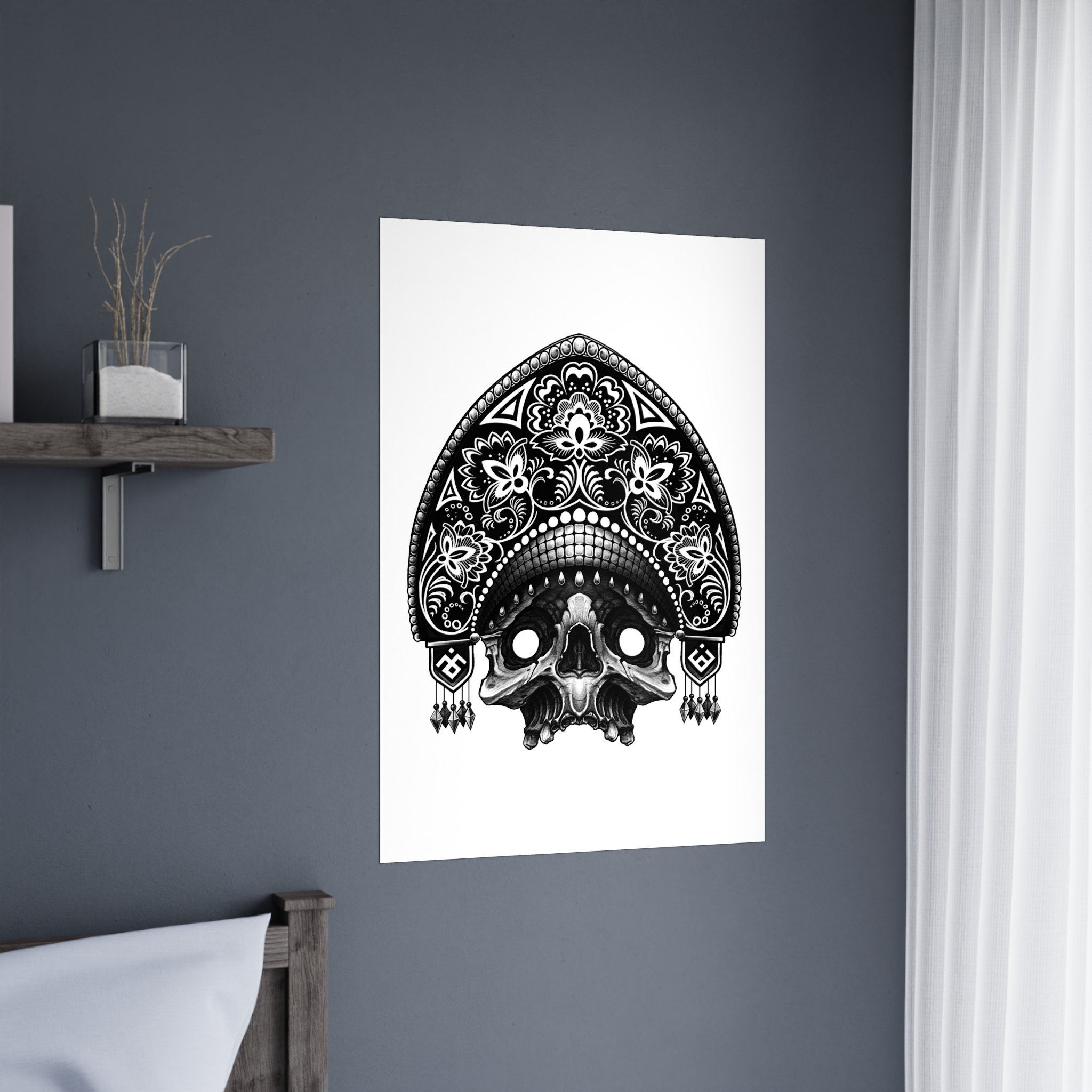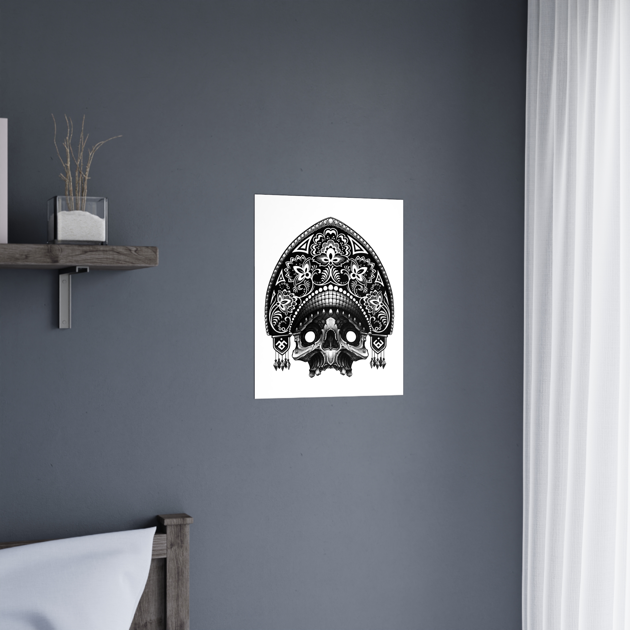 Black-and-white, intricately detailed skull artwork printed on smooth matte paper. The monochrome illustration blends ornamental patterning with a slightly macabre edge, creating a dramatic focal point for bedrooms, studios, and moody living spaces. Printed with eco-sol inks on 175gsm fine art paper, the matte surface reduces glare and emphasizes linework and contrast. Available in multiple orientations and seven sizes to suit gallery walls or a single striking statement piece. Meant for indoor display where its crisp, high-contrast look can set an atmosphere—think candlelit corners, creative workspaces, or curated shelves filled with curios.